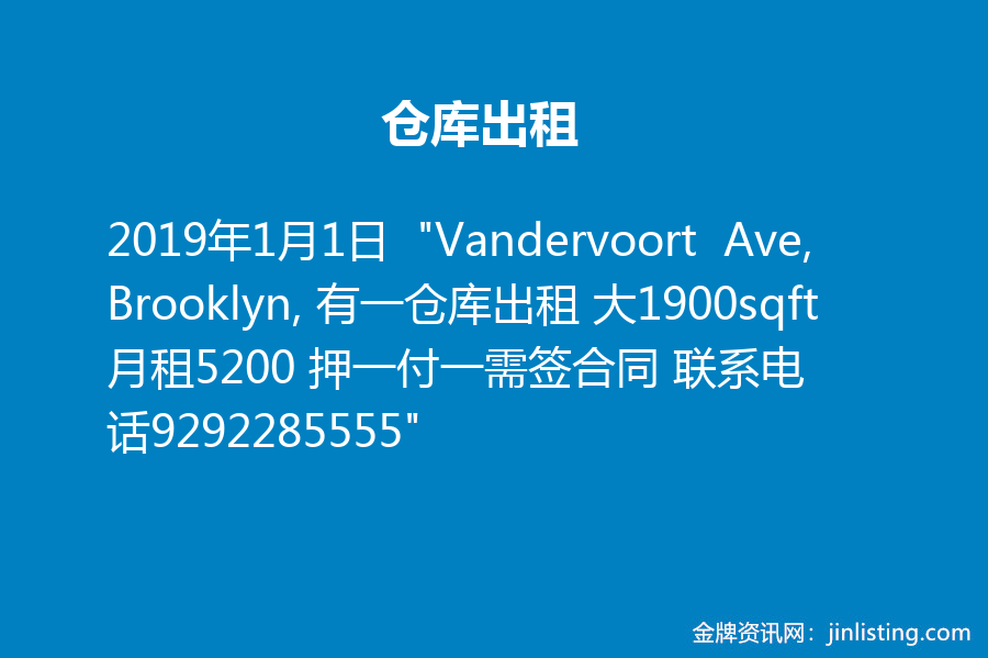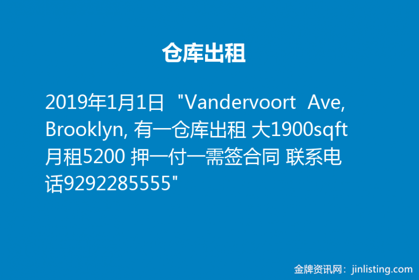 仓库出租 “Vandervoort Ave, Brooklyn, 有一仓库出租 大1900sqft 月租5200 押一付一需签合同 联系电话9292285555”