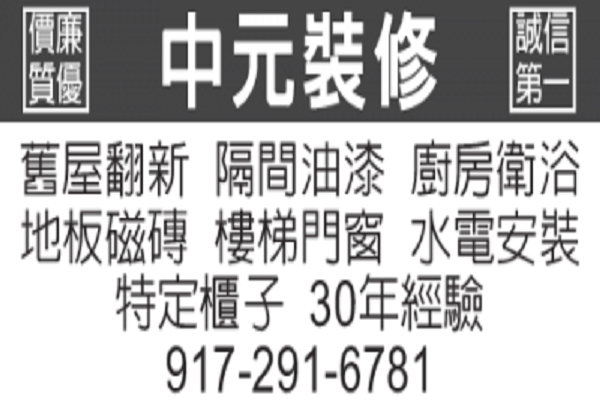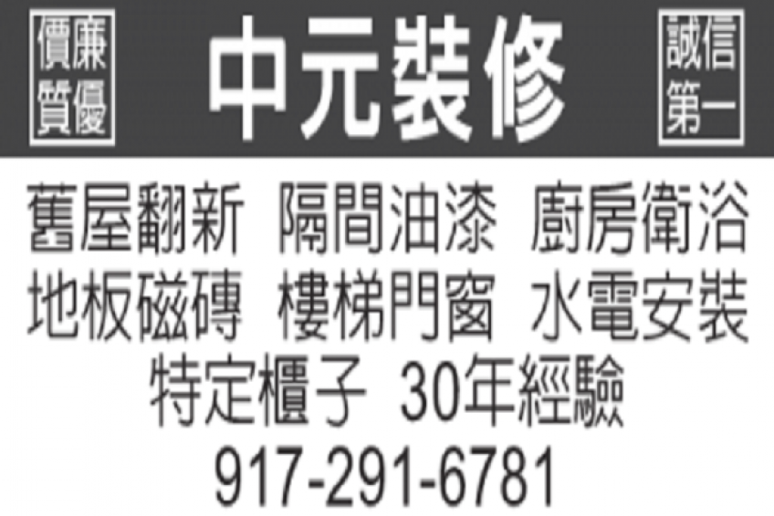 价廉质优 中元裝修 诚信第一 917-291-6781