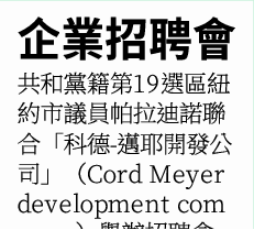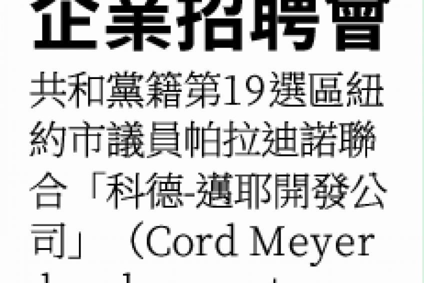 共和黨籍第19選區紐約市議員帕拉迪諾聯合「科德-邁耶開發公司」(Cord Meyer development company)舉辦招聘會。