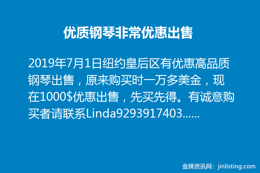 优质钢琴非常优惠出售 纽约皇后区有优惠高品质钢琴出售,原来购买时一万多美金,现在1000$优惠出售,先买先得。有诚意购买者请联系Linda9293917403,微信:Lindawell898