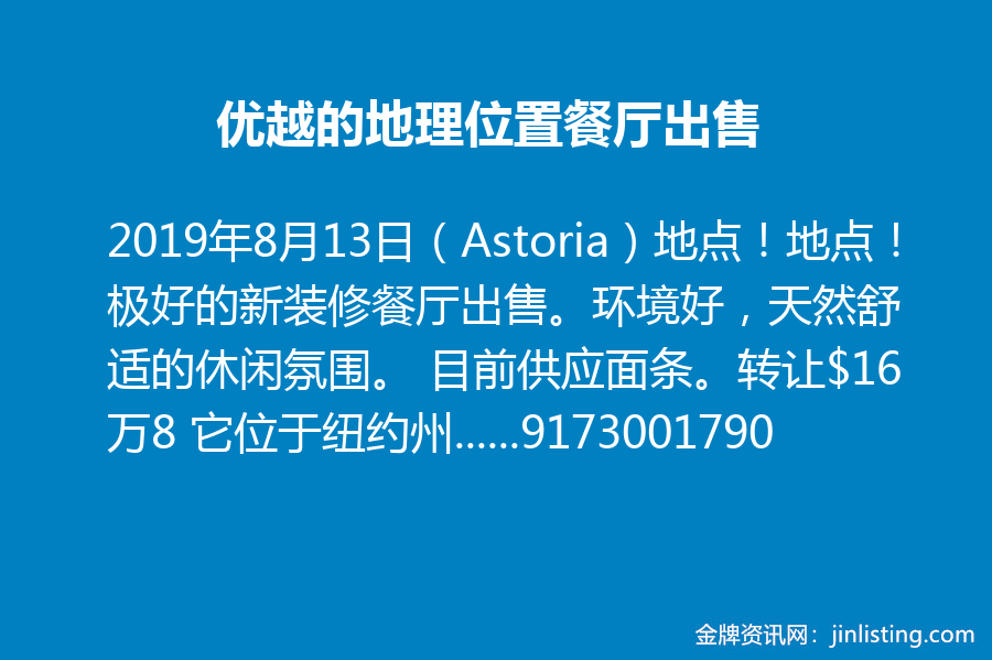 “优越的地理位置餐厅出售(Astoria) 地点!地点!地点! 极好的新装修餐厅出售。环境好,天然舒适的休闲氛围。 目前供应面条。转让$16万8 它位于纽约州Astoria的一个很棒的地段,11103。 角落位置。旁边有两所主要的学校。 有很多很多的人流量。 900平方英尺30个座位。 每月租金$4400美元,3%年增加率, 5年租约,5年续约权。 https://www.youtube.com/watch?v=myVt3-O6ujM 预约看店,请联系:美房置业纽约地产 Henry He何亨利团队 电话May:9173001790或微信何先生:16463388518”