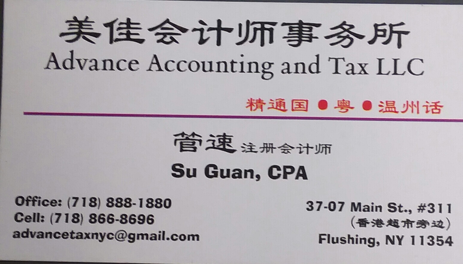 美佳会计师事务所 Advance Accounting and Tax LLC 精通国 @粤 @ 温州话 和鲜速 注册会计师 Su Guan、CPA office: (718) 888-1880