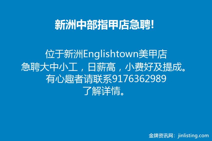 新洲中部指甲店急聘! 位于新洲Englishtown美甲店急聘大中小工,日薪高,小费好及提成。有心趣者请联系9176362989了解详情。