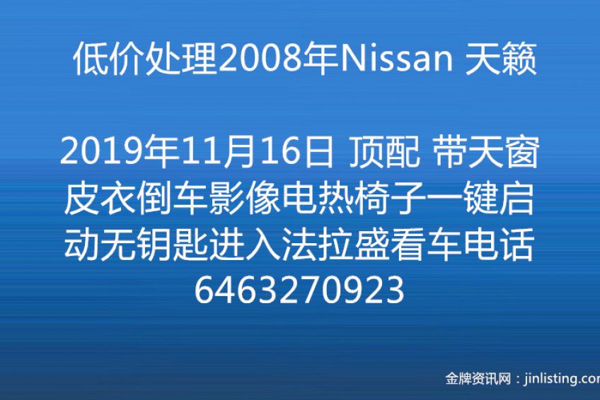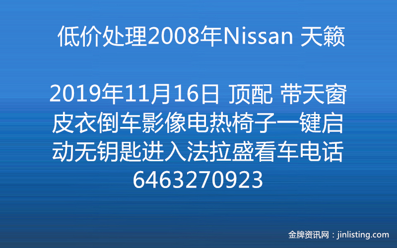 低价处理2008年Nissan 天籁 顶配 带天窗皮衣倒车影像电热椅子一键启动无钥匙进入法拉盛看车电话6463270923