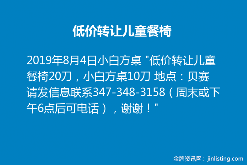 低价转让儿童餐椅,小白方桌 “低价转让儿童餐椅20刀,小白方桌10刀 地点:贝赛 请发信息联系347-348-3158(周末或下午6点后可电话),谢谢!”