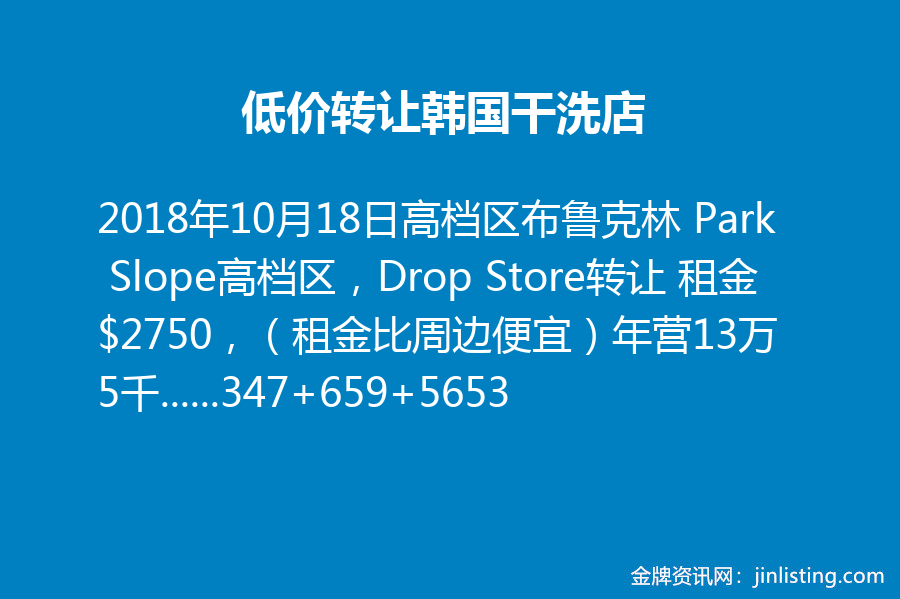 低价转让韩国干洗店,高档区布鲁克林 Park Slope高档区,Drop Store转让 租金$2750,(租金比周边便宜)年营13万5千,仅售4万 稳定顾客群,素质高,很NICE,好打理 有F,G地铁,交通方便 之前没做过,可教,最好会些简单裁剪 抓住这个很好的机会,做自己的生意 请电,347+659+5653
