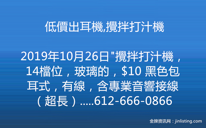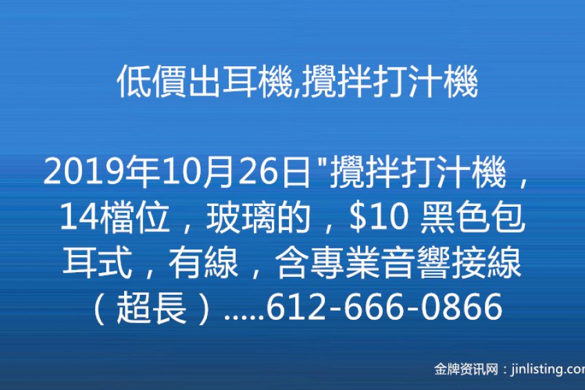 低價出 耳機 , 攪拌打汁機 “攪拌打汁機,14檔位,玻璃的,$10 黑色包耳式,有線,含專業音響接線(超長)和普通接線, 包裝全 $15 坐標:布魯克林八大道交70街自取,自取,自取 電話:612-666-0866可接簡訊”