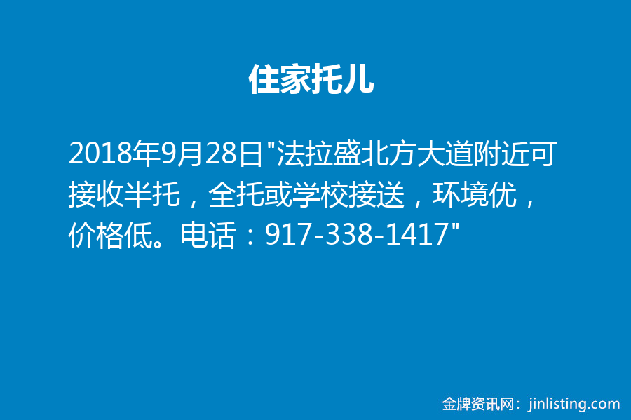 “法拉盛北方大道附近可接收半托,全托或学校接送,环境优,价格低。