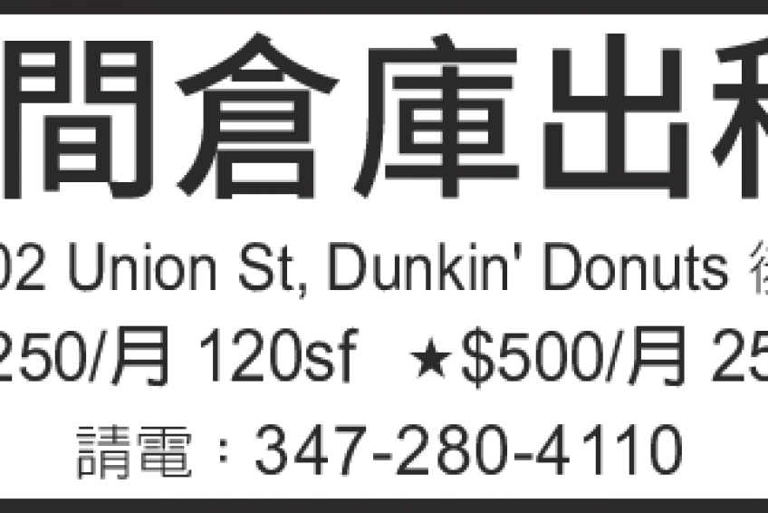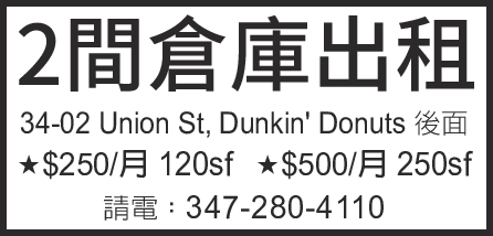 位於34-02 union St,Dunkin donuts 後面的2間倉庫出租$250/月(120sf),$500/月(250sf).請電:347-280-4110