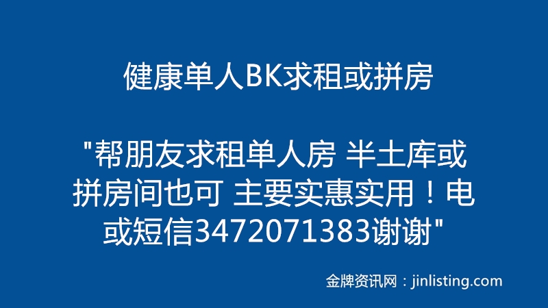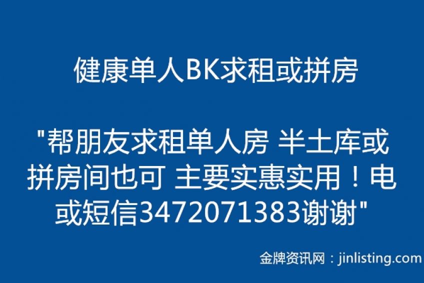 健康单人BK求租或拼房 “帮朋友求租单人房 半土库或拼房间也可 主要实惠实用! 电或短信3472071383谢谢”