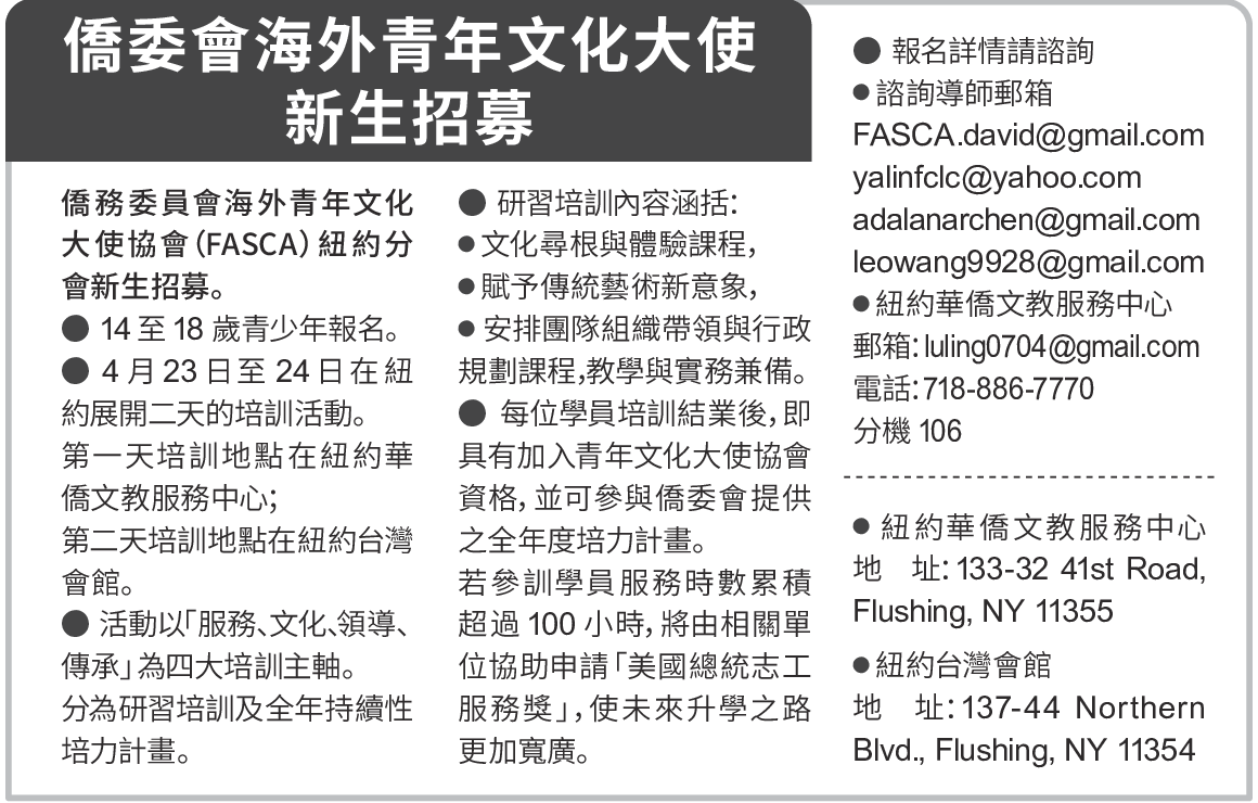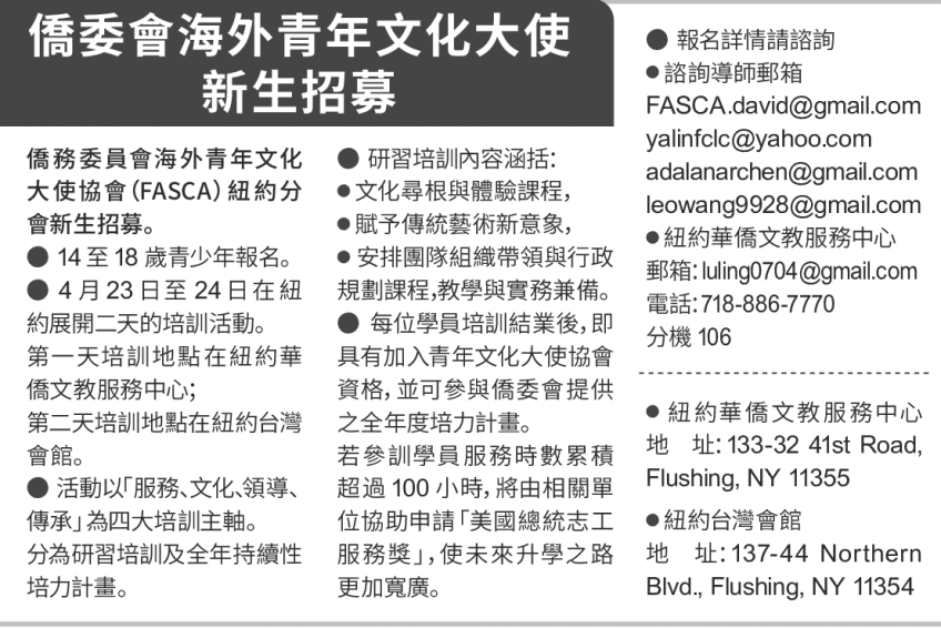 僑務委員會海外青年文化大使協會(FASCA)紐約分會新生招募。