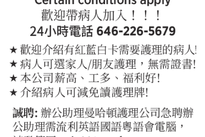 時薪最高 $21.09-$22.09 ! ! Certain conditions apply 歡迎帶病人加入!!! 24小時電話 646-226-5679★ 歡迎介紹有紅藍白卡需要護理的病人! ★ 病人可選家人/朋友護理,無需證書!