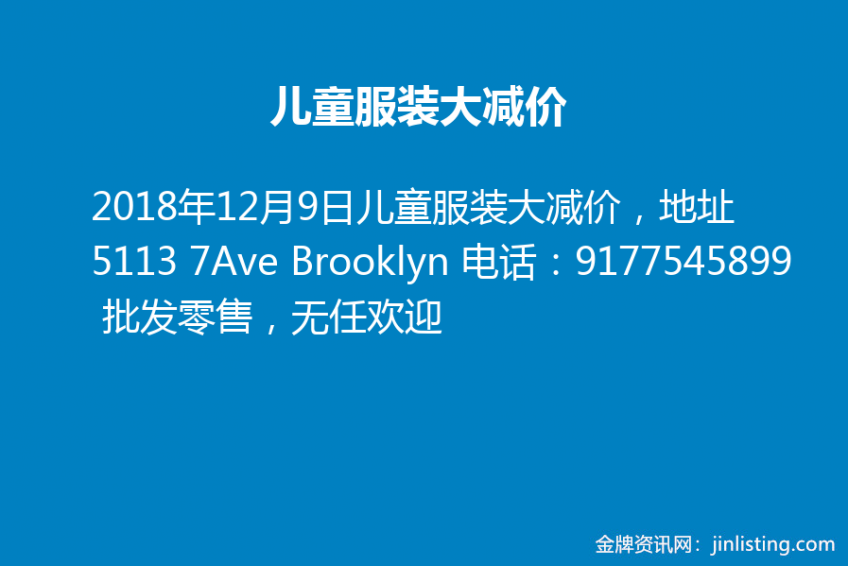 儿童服装大减价,地址5113 7Ave Brooklyn 电话:9177545899 批发零售,无任欢迎
