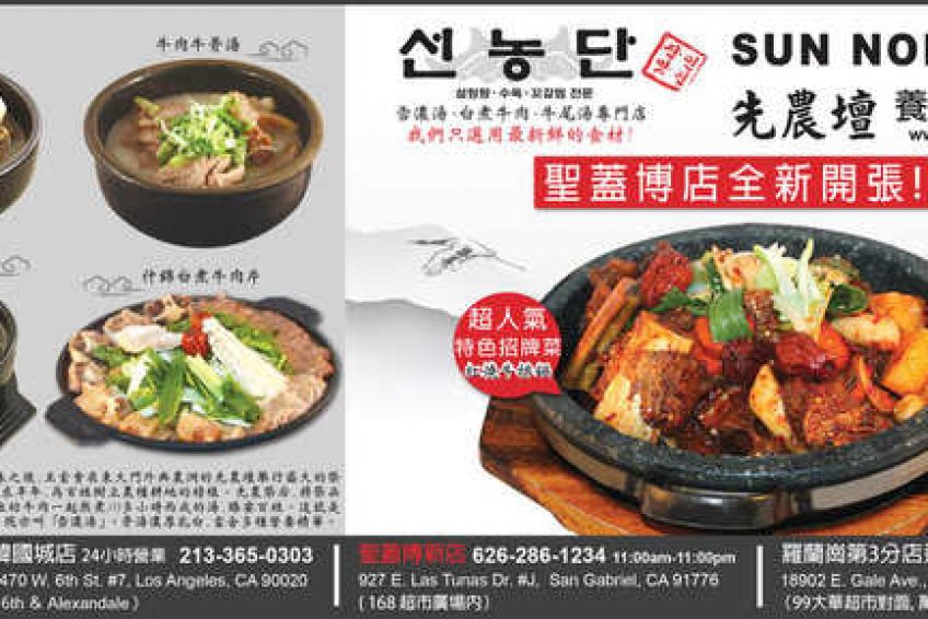 在華人食客中享有超高人氣和美譽的SUN NONG DAN韓國牛肉湯店,在聖蓋博168超市旁開新店啦,就在Las Tunas Drive上,那我們就不用去韓國城排隊等吃了呀,組團去喲! 」聖蓋博新店甫一開張,人氣超旺,平時也要排隊,週末更是要大排長龍。 」征服味蕾靠得就是不折不扣的食物味道。這里傳統主打的養生雪濃湯經過去腥處理,10多小時精心熬燉,無任何添加。白白濃濃的湯,骨頭融化成了液體,鮮濃潤滑而不膩,湯中的味道和營養完全滲出,富含鈣丶蛋白質丶膠質及各種營養精華,滋補又養顏。最討人喜的是不得不嚐的鎮店特色招牌菜——高人氣紅燒牛排骨石鍋。先農壇是一家專營韓國雪濃湯丶清煮牛肉湯鍋丶牛尾湯專門店,店家承諾只選用最新鮮的食材。確實如此,不新鮮真做不出那令人食指大動的美味。先農壇養生韓國料理店以超標營養值丶超高新鮮度和美味度征服食客味蕾。雖然菜色不算太多,但道道精選,樣樣精心烹煮。開業幾週,先農壇聖蓋博店也大排長龍了,看看yelp的點評,對先農壇的美味是眾口一詞。 SUN NONG DAN 位於韓國城6街的先農壇1號店,,7天24小時營業不打烊,就餐高峰和周末時間幾乎都會大排長龍。店主說70%的顧客都是中國人。