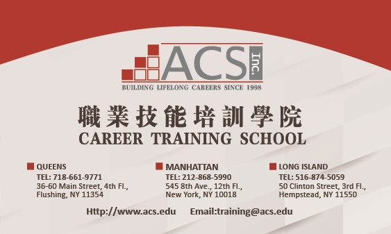 ACS職業培訓學院Alliance Computing Solutions經全國資格認證機構認證,並通過紐約州教育局認證的職業培訓學校,同時由美國聯邦國安局授權接受國際學生,被紐約州勞工局及退伍軍人認定為定點職業培訓機構。學院成立於1998年,坐落在法拉盛中心與曼哈頓,20多年豐富的優質教學經驗,擁有資深的優秀教師團隊。我們的課堂將理論和實踐設計成有系統性的實操演練環節,靈活互動的課堂體驗,強調提升學員的技能素養。