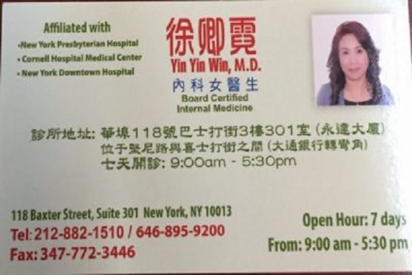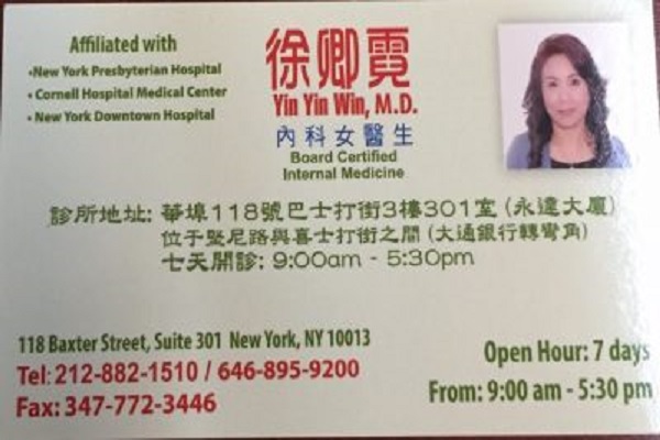 內科家庭醫生 徐卿霓Yin Yin Win 醫學博士M.D.- 212-882-1510 118 Baxter St #301, New York, NY 10013美国