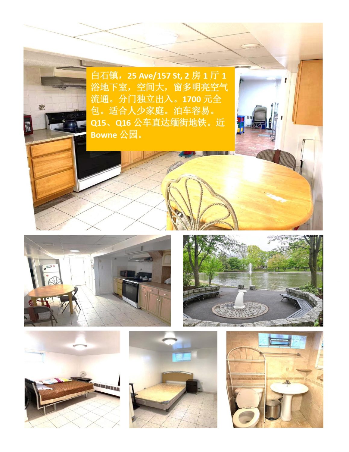 白石镇2房1厅1浴室地下室,空间宽敞、窗多明亮空气流通;分门独立出入。1700元全包。适合人少家庭,无宠物。环境幽静,极易泊车,交通方便。Q15、Q16公车直达缅街地铁。步行至你喜欢的Bowne公园,伴随你晨运的美景。速电347-445-3366 王