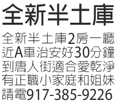 兩房一廳近A車治安好。30分鐘到唐人街,適合愛乾淨有正職小家庭和姐妹。9173859226。