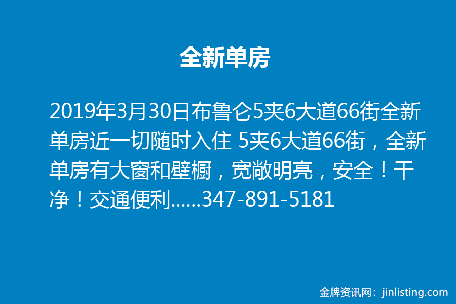 布鲁仑5夹6大道66街全新单房近一切随时入住 5夹6大道66街,全新单房有大窗和壁橱,宽敞明亮,安全!干净!交通便利。路边停车方便,只限女性1人,近超市和NR车,有意联系杨小姐:347-891-5181