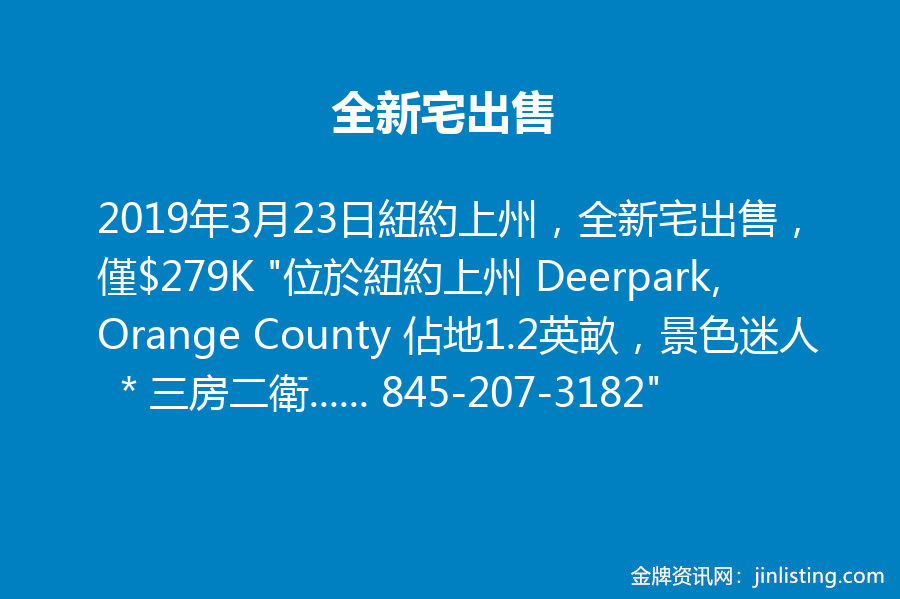 紐約上州,全新宅出售,僅$279K “位於紐約上州 Deerpark, Orange County 佔地1.2英畝,景色迷人 *三房二衛 *廚房、浴室採石質台面 *木質地板、金屬屋頂 *天花板高9英尺 *三層式玻璃窗 *免費太陽能板 *淨零能源住宅 洽Lily 845-207-3182”