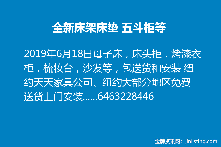 全新床架床垫,五斗柜,母子床,床头柜,烤漆衣柜,梳妆台,沙发等,包送货和安装 纽约天天家具公司、纽约大部分地区免费送货上门安装,我们的微信号:jiaju6463228446,也可以直接扫描图中二维码,公司电话:6463228446. 价格优惠!