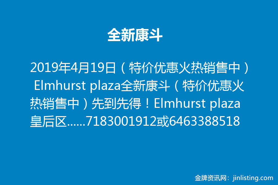 全新康斗(特价优惠火热销售中) Elmhurst plaza全新康斗(特价优惠火热销售中) 先到先得! Elmhurst plaza皇后区Elmhurst 最中心地段, 周边有公园 大型超市 是唯一的大型Condo, 一楼大型超市地下室停车场,每个单元都有阳台, 装修和配置采用高档的材料,优雅高档又舒服, 适合自住,投资,退休! 请电或微信何亨利团队7183001912或6463388518