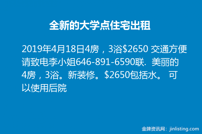 全新的大学点住宅出租 4房,3浴$2650—- 交通方便 请致电李小姐646-891-6590联… 美丽的4房,3浴。 新装修。 $ 2650包括水。 可以使用后院