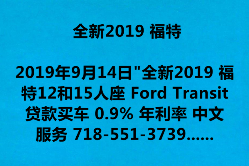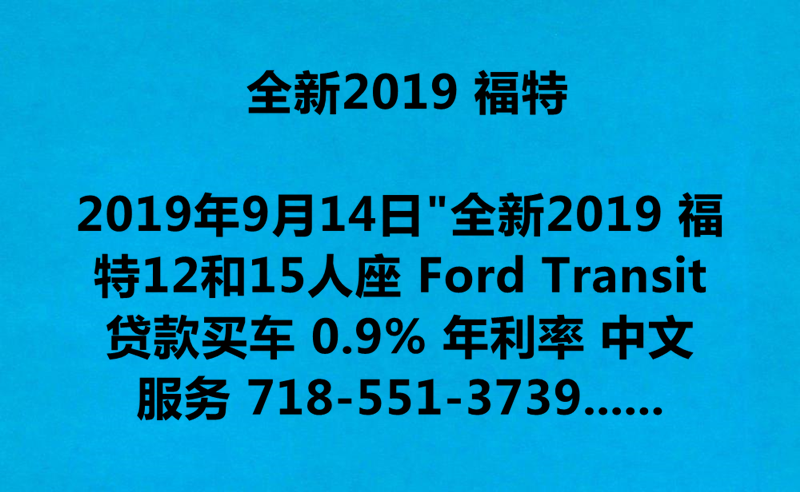 “全新2019 福特12和15人座 Ford Transit 贷款买车 0.9% 年利率 中文服务 718-551-3739 纽约最大福特/林肯4S店: Ford Lincoln of Queens 地址: 139-48 Queens Blvd, Jamaica, NY 11435”