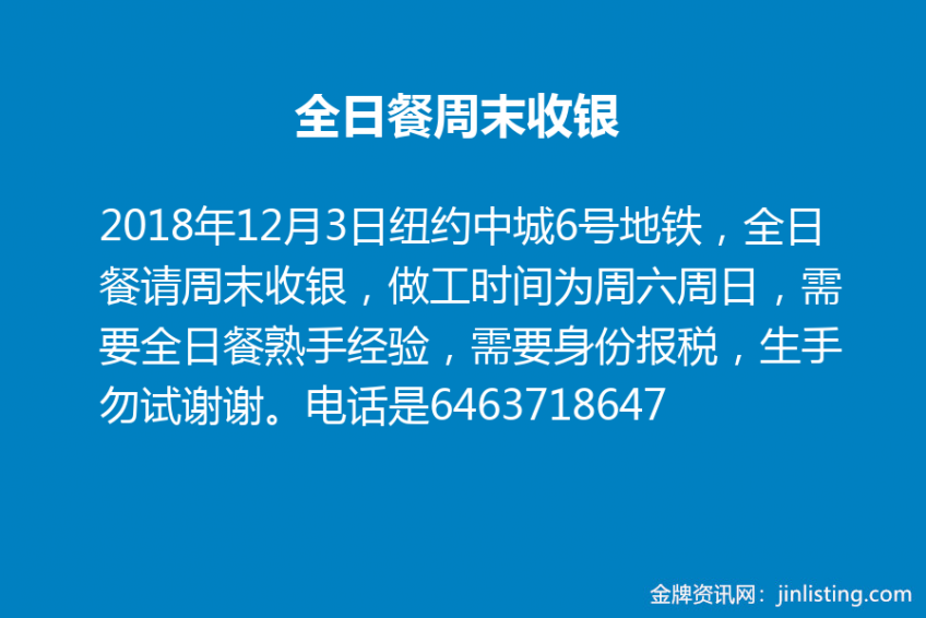 全日餐周末收银 纽约中城6号地铁,全日餐请周末收银,做工时间为周六周日,需要全日餐熟手经验,需要身份报税,生手勿试谢谢。电话是6463718647