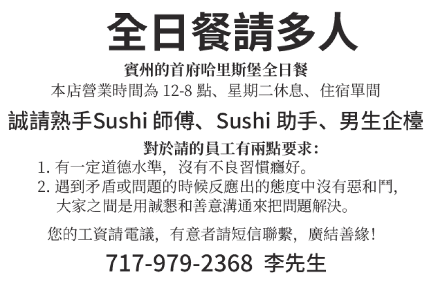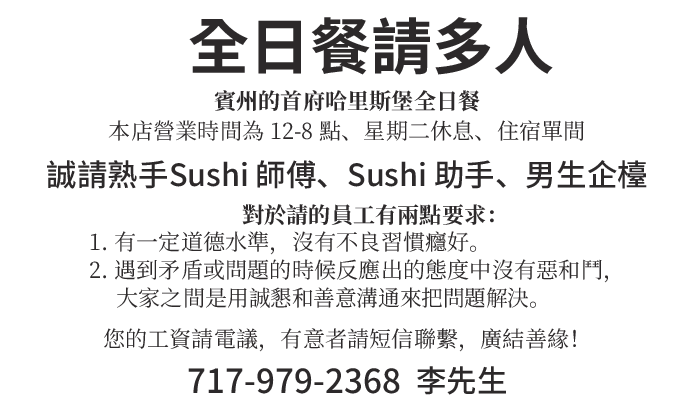 本店是全日餐,在賓州的首府哈里斯堡。現誠請熟手sushi 師傅和sushi助手,男生企台,本店營業時間為12-8點,週二休息,住宿單間。對於請的員工有兩點要:1,有一定道德水準,沒有不良習慣癮好。2,遇到矛盾或問題的時候反應出的態度中沒有惡和斗,大家之間是用誠懇和善意溝通來把問題解決。有意者請短信聯繫,您的工資請電意。廣結善緣!717-979-2368!李先生!