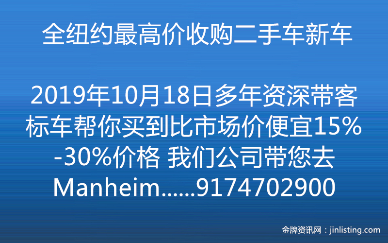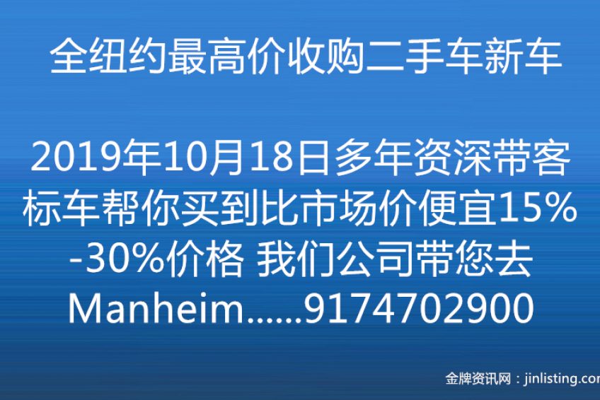全纽约最高价收购二手车购买新车,多年资深带客标车帮你买到比市场价便宜15%-30%价格☎️ 9174702… 我们公司带您去 Manheim –全美最大型最正规汽车拍卖场标车,星期三新泽西,星期四丶五 宾夕法尼亚州,每周近2万辆车供选择,批发价出售。标车前电脑检测丶提供AutoCheck报告,10年经验专业技师选车,买车多重保障!可申请贷款,协助办理年审,买保险,上牌等手续.经验丰富,诚信可靠,手续简单,即日取车, 不成功不收费。联系电话☎️ 9174702900
