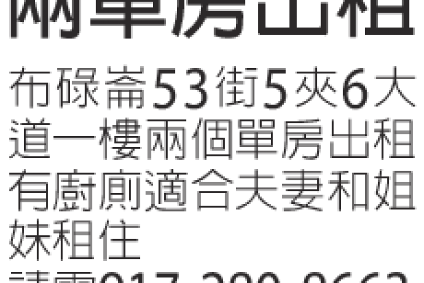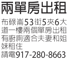 布綠崙53街 5夾6大道一樓,有兩個單房出租,有廚廁.適合夫妻和姐妹租住.意者請電917-280-8663