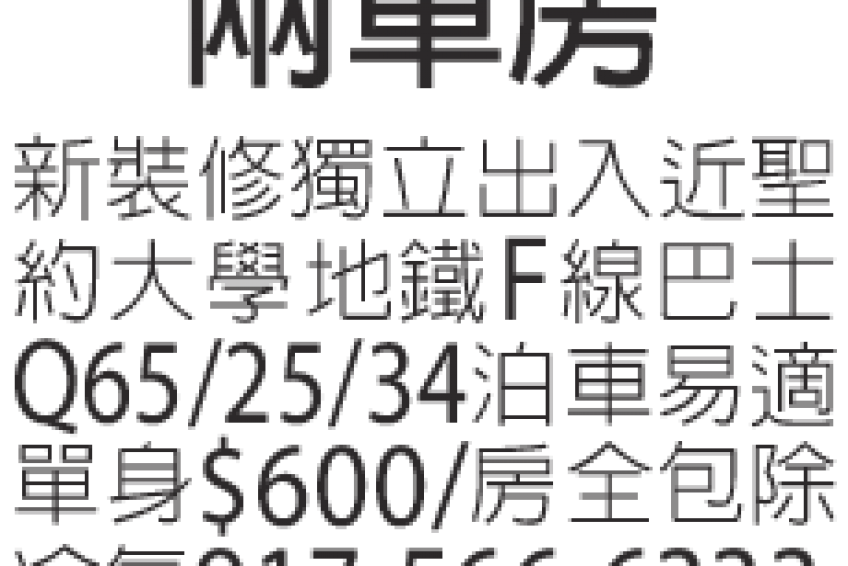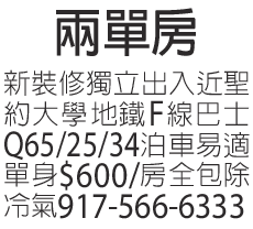 全新裝修,獨立出入,近聖約大學,地鐵F線,巴士Q65/25/34,泊車易,適合單身,每房$600(全包),冷氣不包。電:917-566-6333