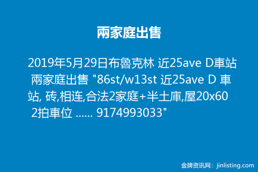 布魯克林 近25ave D車站 兩家庭出售 “86st/w13st 近25ave D 車站, 砖,相连,合法2家庭+半土庫,屋20×60 2拍車位 ,2摟前後座可作3家庭用(以分表).$139萬. 6月1,2号, 6月8,9号公展, 1~3 pm 地址及详情,请联络。地产黄生 9174993033”