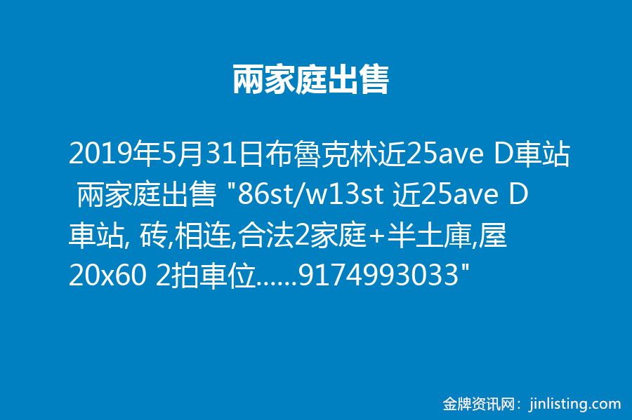 布魯克林 近25ave D車站 兩家庭出售 “86st/w13st 近25ave D 車站, 砖,相连,合法2家庭+半土庫,屋20×60 2拍車位 ,2摟前後座可作3家庭用(以分表).$139萬. 6月1,2号, 6月8,9号公展, 1~3 pm 地址及详情,请联络。地产黄生 9174993033”