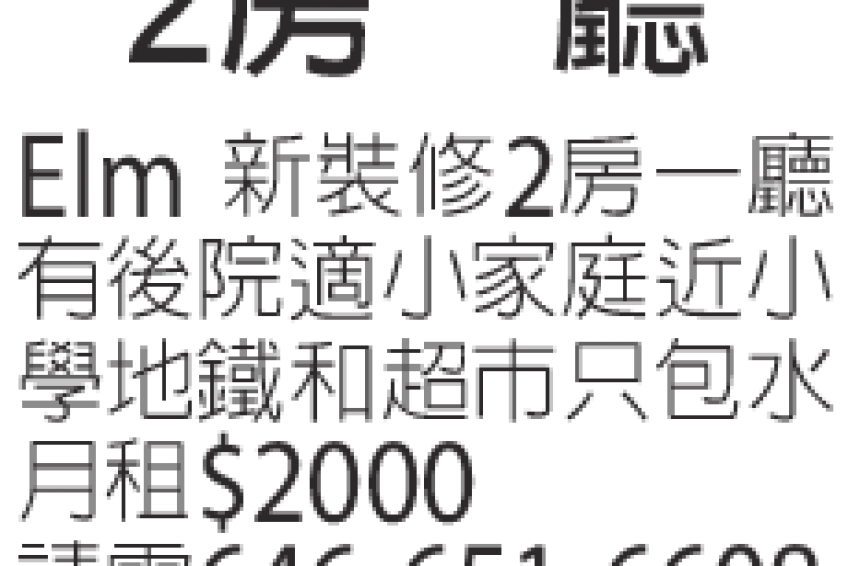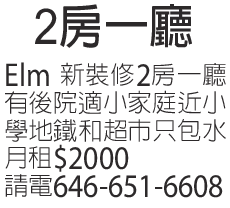 Elm 新裝修 有後院 適 小家庭 近小學地鐵和超市 只包水月租$2000 請電646-651-6608