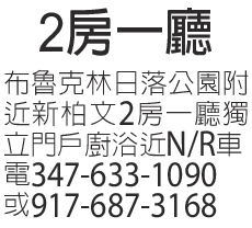 布魯克林日落公園附近 新柏文兩房一廳 獨立門戶、廚、浴 近N R 車電1-347-633-1090 或1-917.687.3168