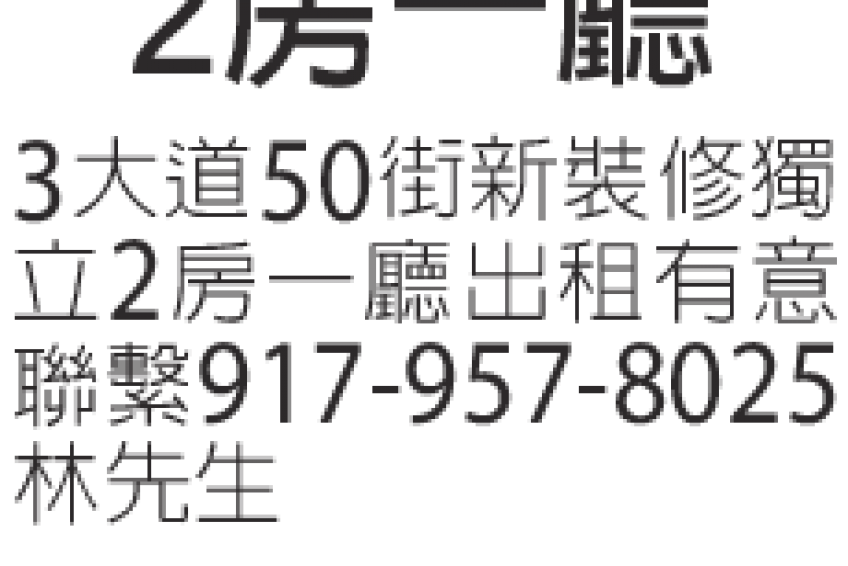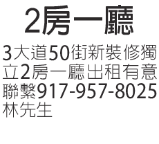 3大道50街新裝修獨立兩房一廳出租有意者聯繫:917-957-8025 林先生