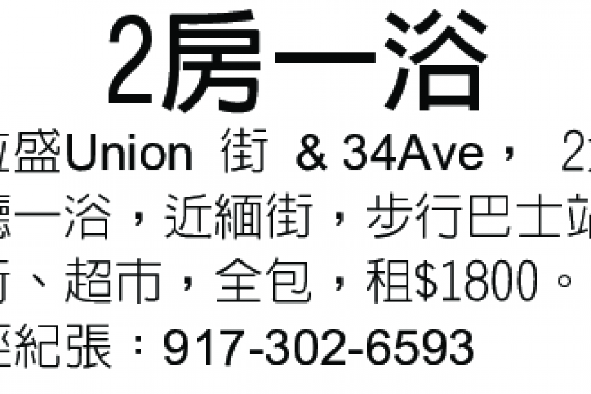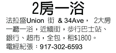 法拉盛Union 街 & 34Ave, 兩大房一廳一浴,近緬街,步行巴士站、銀行、超市,全包,租$1800 電經紀張:917-302-6593