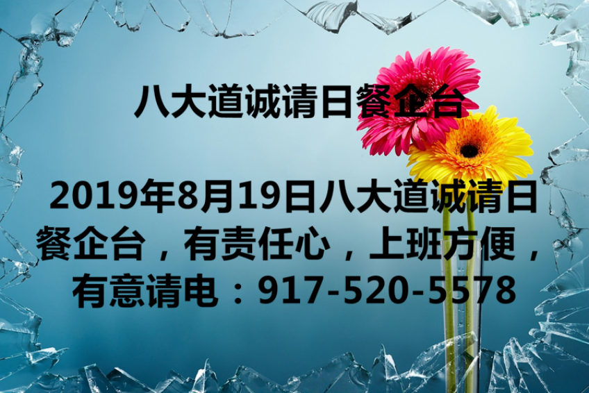 八大道诚请日餐企台,有责任心,上班方便,有意请电:917-520-5578