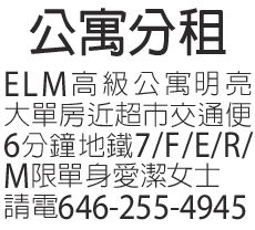 ELM高級公寓明亮大單房近超市交便6分鐘地鐵7 FERM限單身愛潔女士。電 646-255-4945