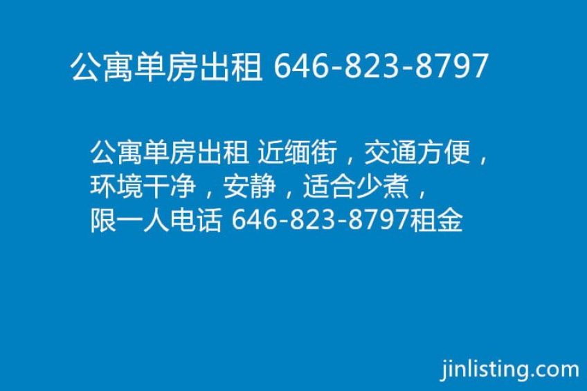 公寓单房出租 近缅街,交通方便,环境干净,安静,适合少煮,限一人电话 646-823-8797租金