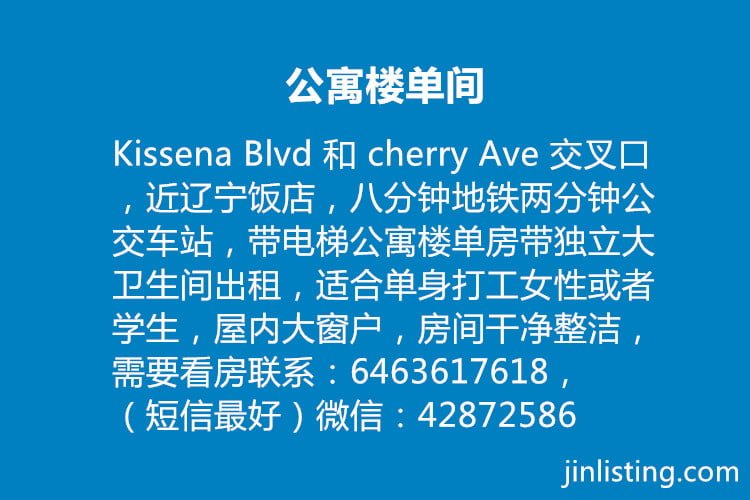 Kissena Blvd 和 cherry Ave 交叉口,近辽宁饭店,八分钟地铁两分钟公交车站,带电梯公寓楼单房带独立大卫生间出租,适合单身打工女性或者学生,屋内大窗户,房间干净整洁,需要看房联系:6463617618,(短信最好)微信:42872586