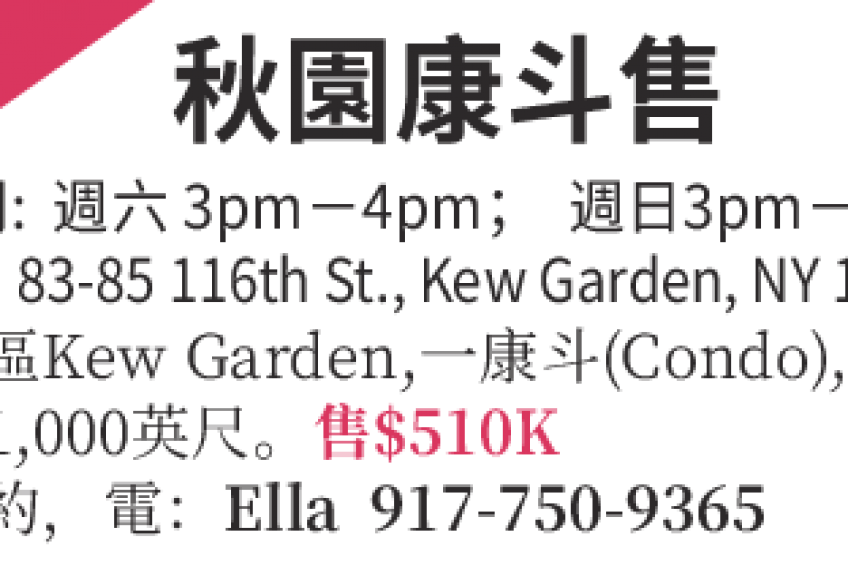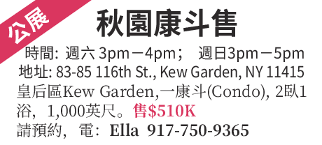 皇后區Kew Garden,一康斗(Condo), 2臥1浴,1,000英呎,售:$510K, 請預約,電:Ella (917) 750-9365