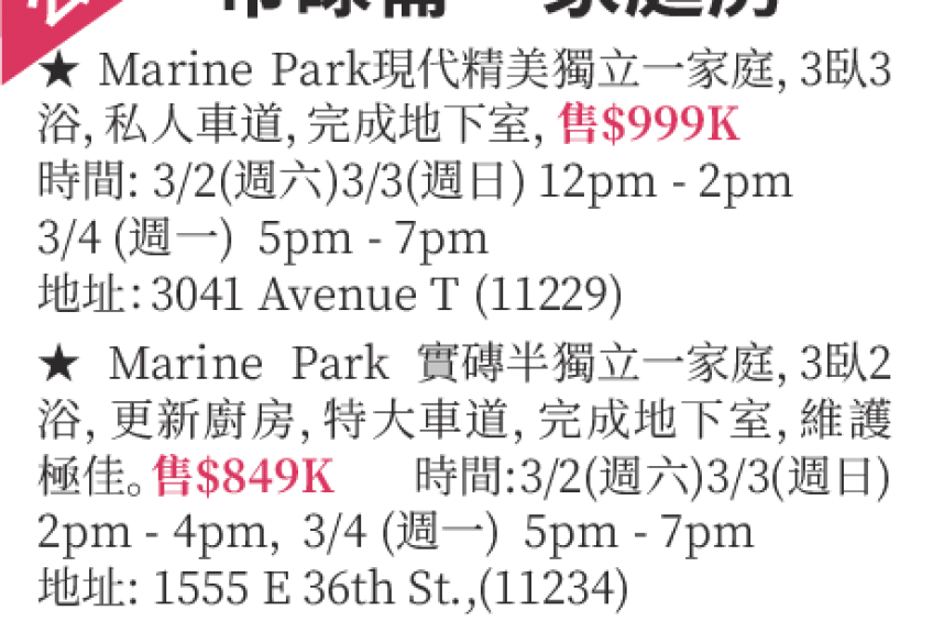 2 .時間:3/2(週六)& 3/3(週日), 2 – 4pm, & 3/4 (週一)5 -7 pm, 地址: 1555 E 36th St, Brooklyn, NY 11234