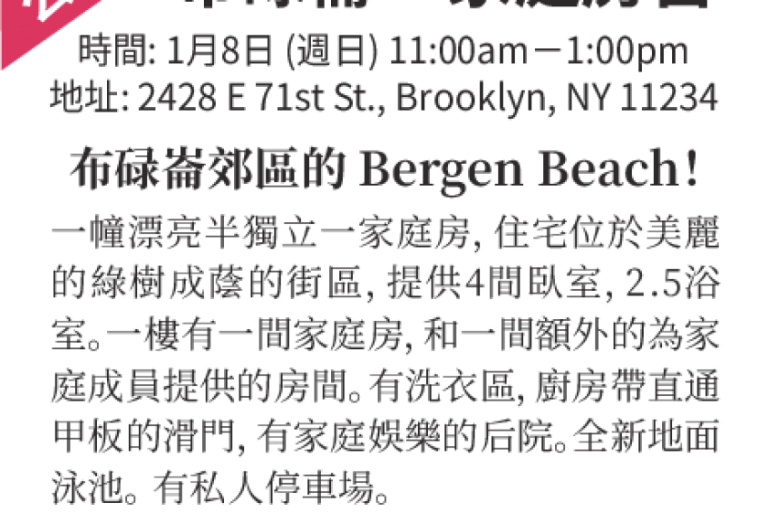 公展:時間 1月8日 (週日)上午 11 點 至 下午 1 點地址:2428 E 71st St, Brooklyn, NY 11234