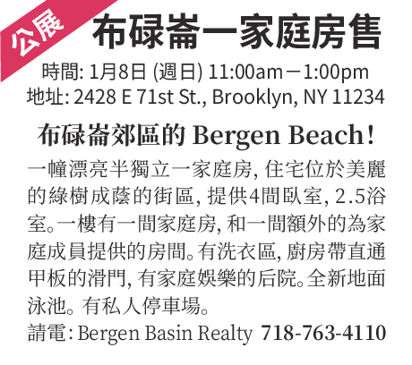 一幢漂亮半獨立一家庭房,坐落在被譽為“布魯崙郊區”的 Bergen Beach!這棟住宅位於美麗的綠樹成蔭的街區,提供4間臥室,2.5浴室。一樓有一間家庭房,和一間額外的為家庭成員提供的房間。還包括洗衣區,廚房帶直通甲板的滑門,家庭娛樂的后院。全新地面泳池。 另有私人停車場。電:BERGEN BASIN REALTY 718 763 4110