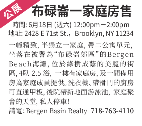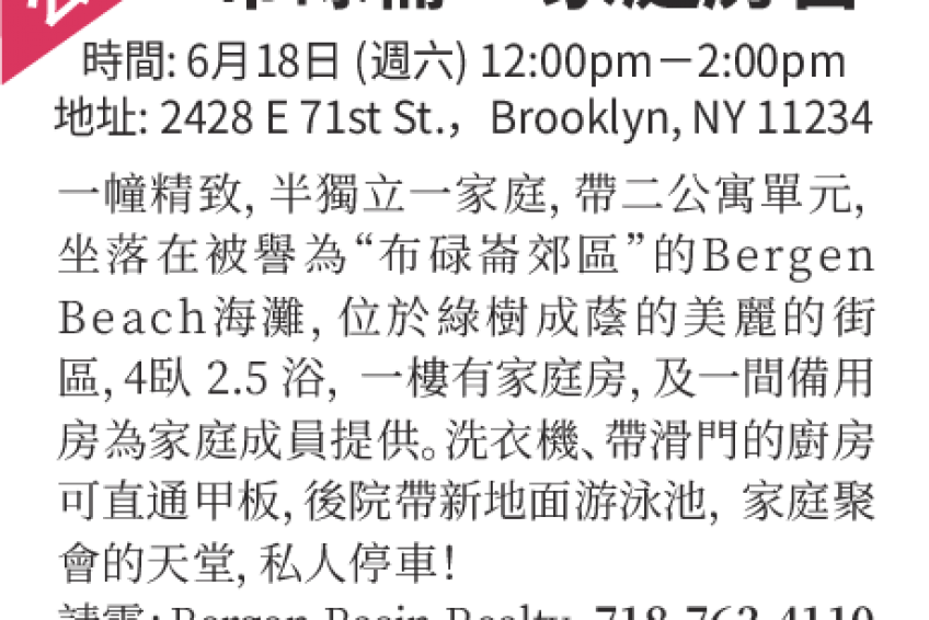 一幢精致,半獨立一家庭,帶二公寓單元,坐落在被譽為“布魯崙郊區”的Bergen Beach 海灘, 位於綠樹成蔭的美麗的街區,4臥 2.5 浴, 一樓有家庭房,及一間備用房為家庭成員提供。洗衣機、帶滑門的廚房可直通甲板,後院帶新地面游泳池, 家庭聚會的天堂,私人停車!電:BERGEN BASIN REALTY 718 763 4110