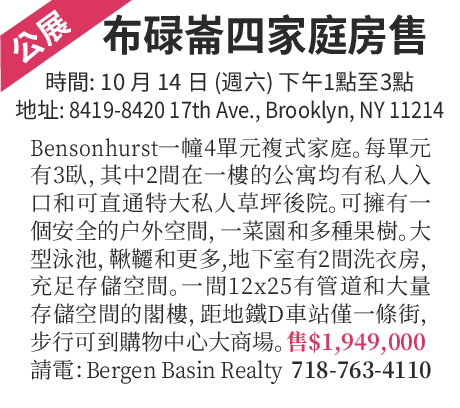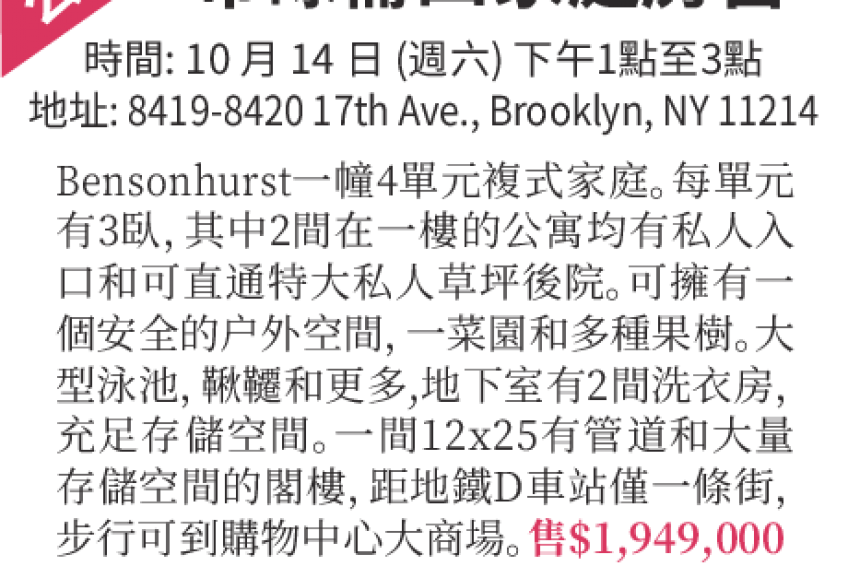 布魯崙Bensonhurst的17th 大道,一幢氣勢4個單元複合式家庭住宅。每單元有3間臥室,其中2間在一樓的公寓均有私人入口和可直通特大私人草坪後院。您的孩子可擁有一個安全的戶外空間,一菜園和多種果樹。 大型泳池,鞦韆和更多, 是大型戶外聚會的最理想之地。地下室有2間洗衣房,病有充足的存儲空間。 一間12×25 的擁有管道和大量存儲空間的閣樓,距地鐵D車站僅一條街,步行可到購物中心和 Marshall’s,Motivated seller! 售:$1,949,000,