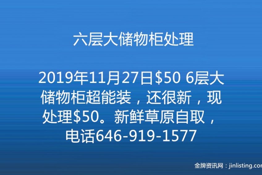 六层大储物柜处理$50 6层大储物柜超能装,还很新,现处理$50。新鲜草原自取,电话646-919-1577